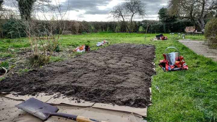 To clear a growing space the no-dig way, apply a water-permeable biodegradable layer such as cardboard to the ground in the early spring, give it a good soaking with some water, then add an inch of compost (or more) on top and firm in gently with your foot. Job done!